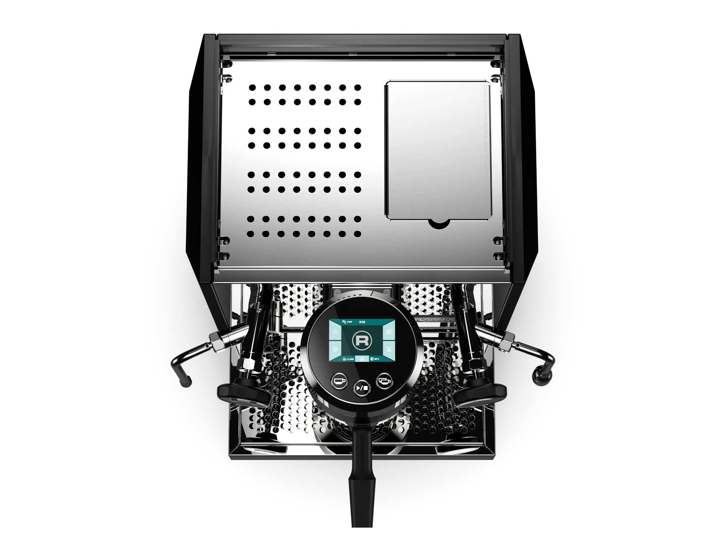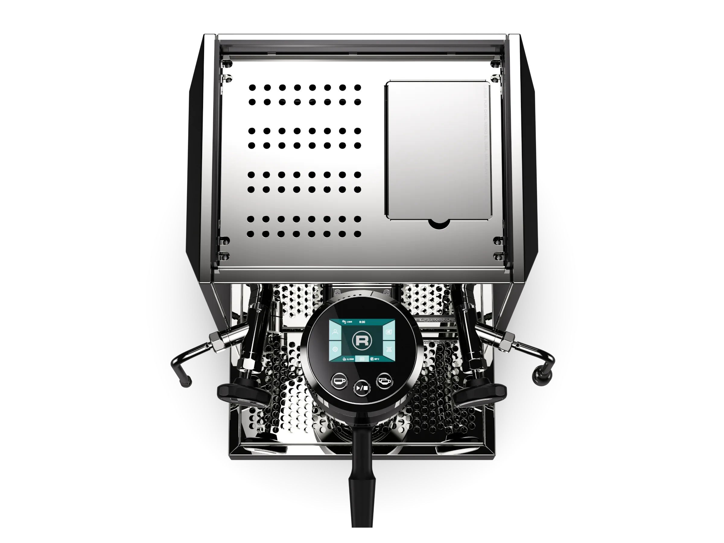 The group head is composed of three contrasting bands, with the top and bottom bands featuring distinct beveled edges. Although the group head body is entirely made of metal, its design pays homage to its technical performance with an intuitive touch interface located on its top surface.Machine Body
