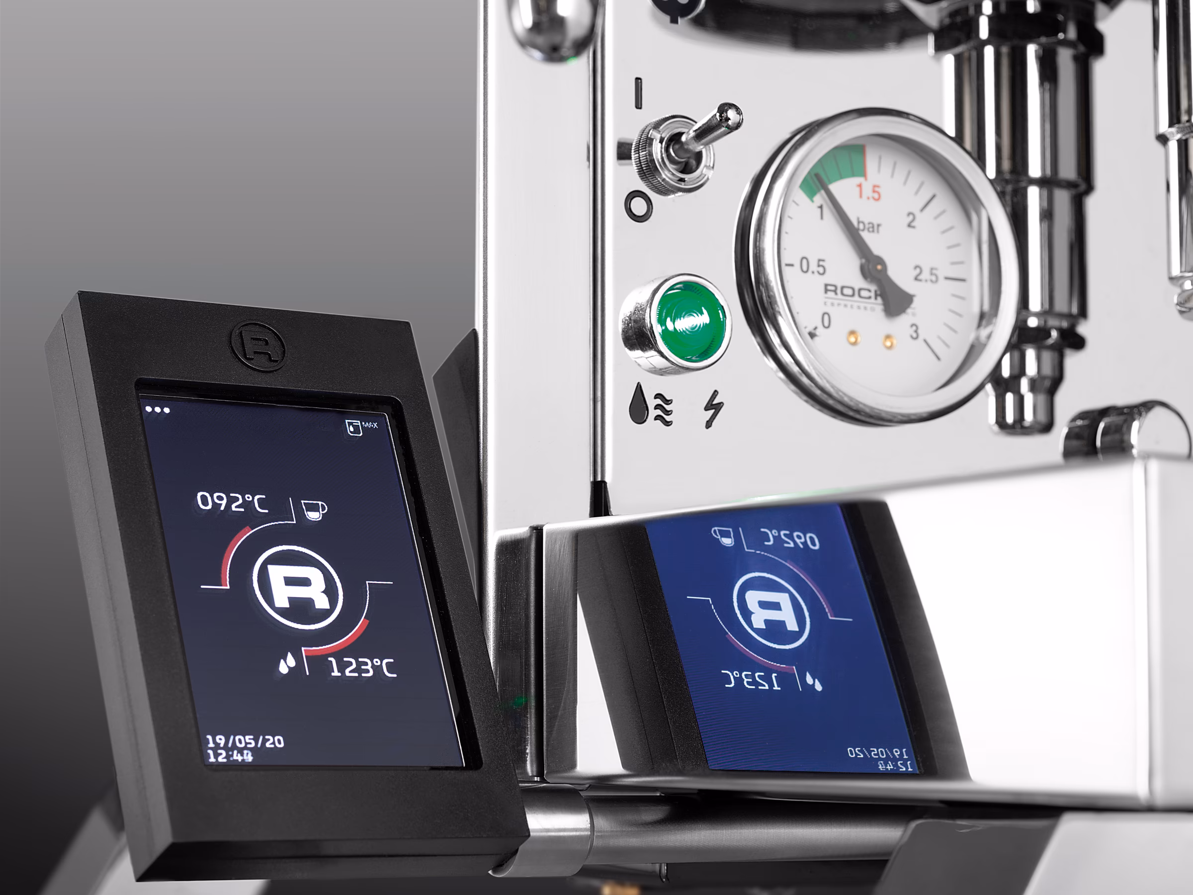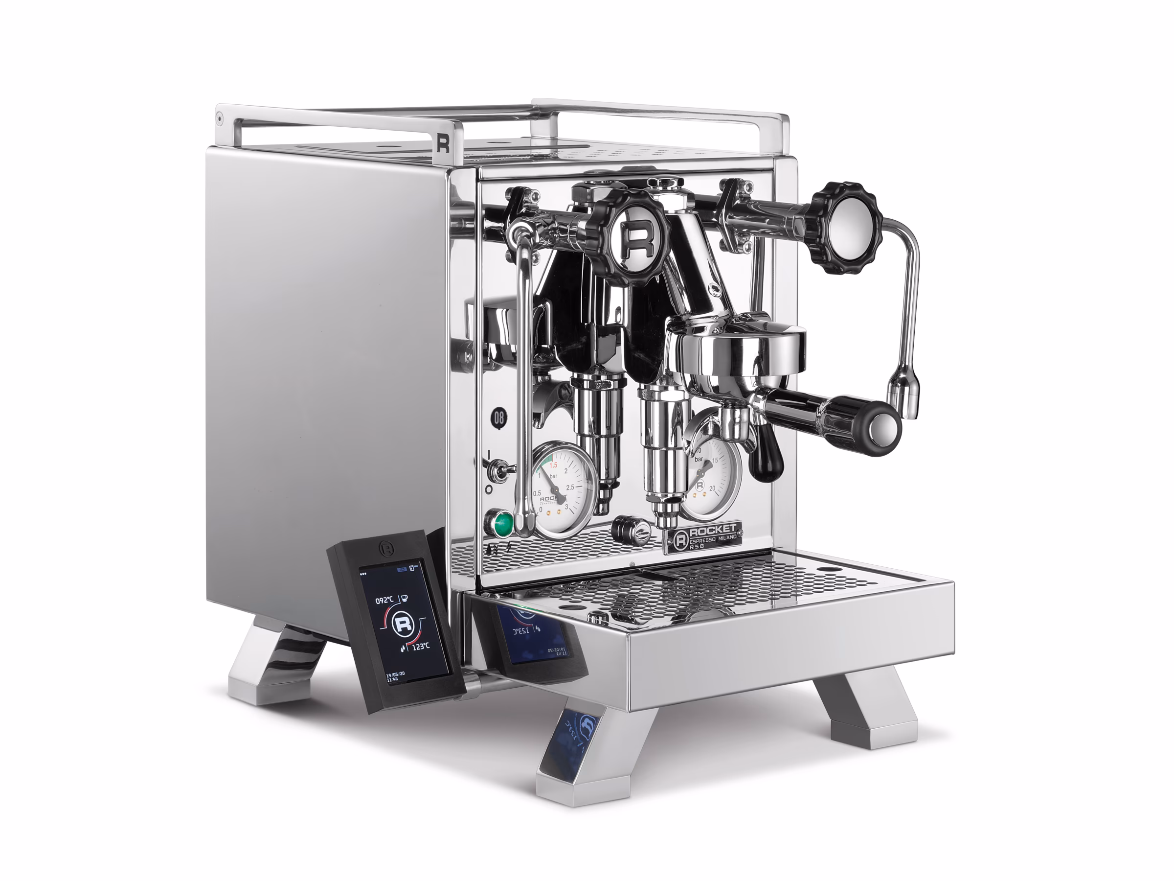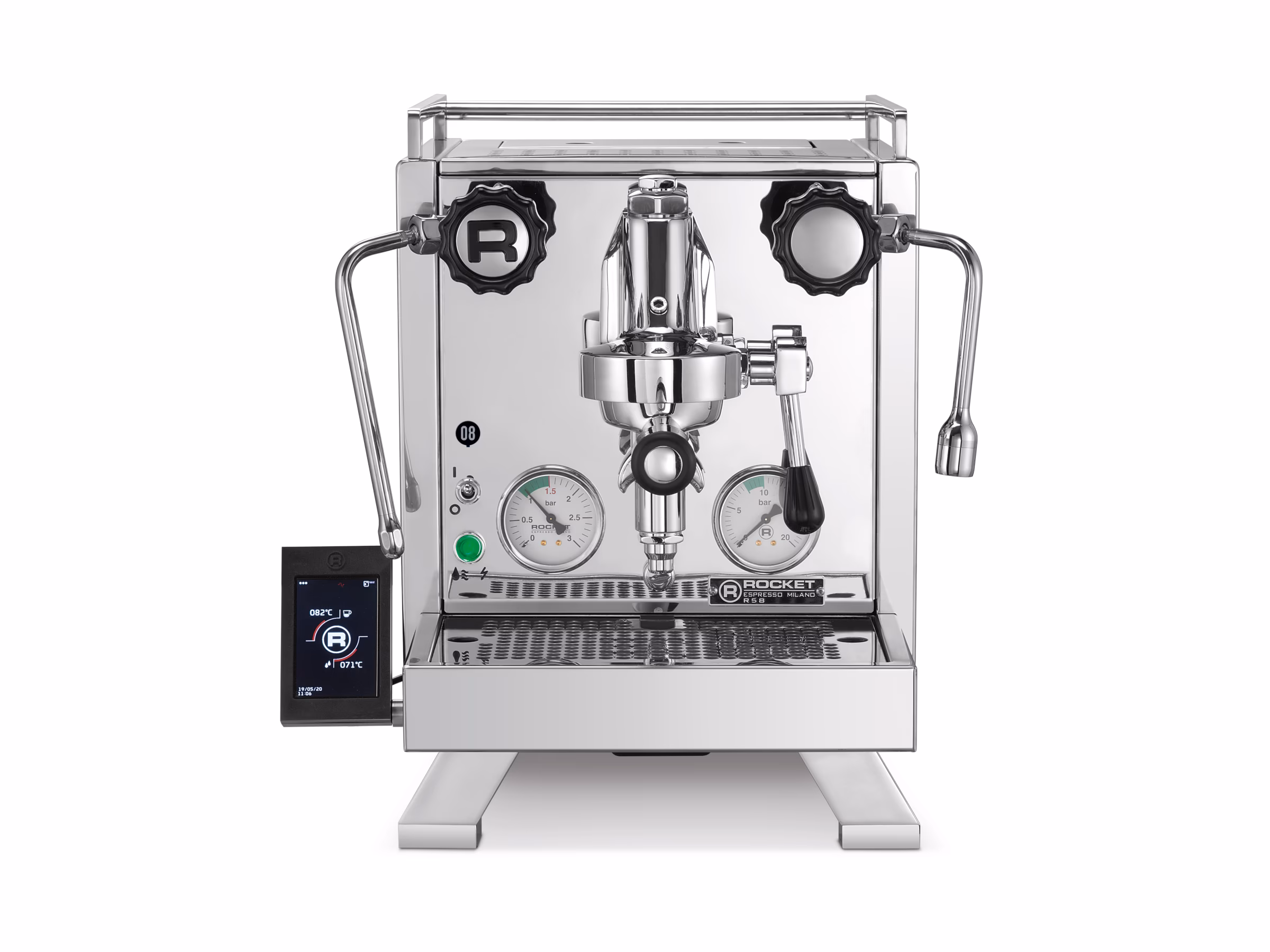 Cinquantotto translates to 58, the new R 58 from Rocket Espresso. Two independent boilers with PID control allow for optimal extraction of all types of coffee and roasts. Rocket Espresso's inclined boiler technology ensures precise group temperature control and unparalleled thermal stability. The professional rotary pump draws water from the machine's internal reservoir or allows for direct connection to the mains water supply. The machine's functions are controlled via the touchscreen control panel, which now includes an automatic on/off function: your machine is ready to use whenever you're in the mood for coffee. The control panel is easily removable to preserve the iconic Rocket Espresso aesthetic.